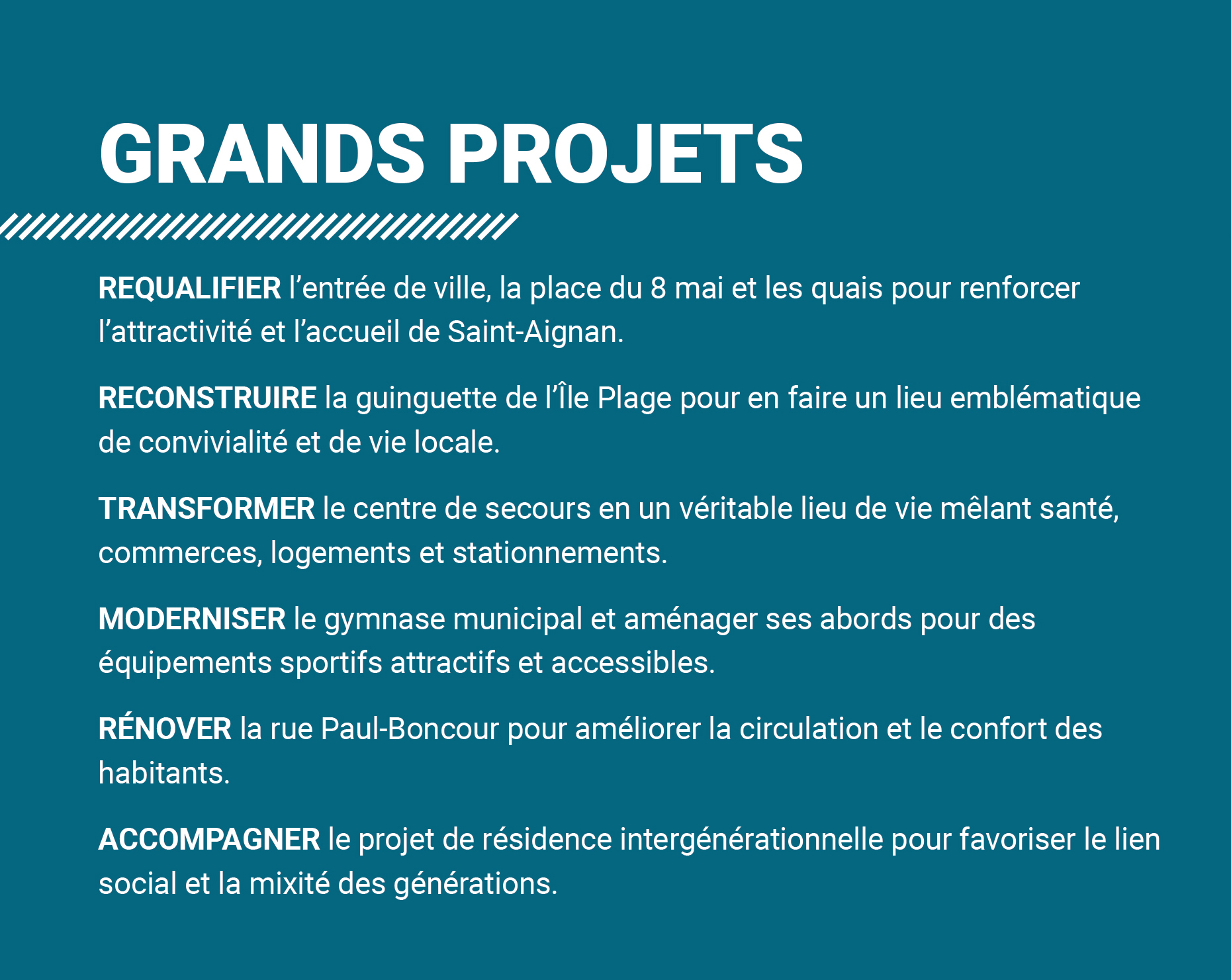 Aujourd’hui, avec l’expérience accumulée au cours de ces douze années et une volonté intacte de servir Saint-Aignan, je souhaite poursuivre ce chemin avec vous. Les années à venir seront l’occasion d’achever les projets engagés, d’en lancer de nouveaux et de continuer à faire de notre commune un lieu où il fait bon vivre, grandir, travailler et se retrouver.