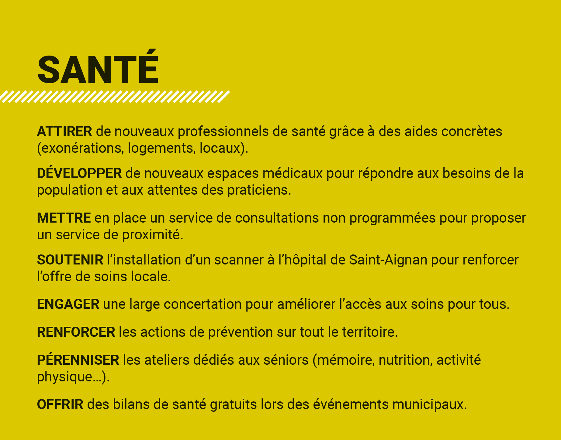 Le travail accompli m’amène légitimement à vous présenter un bilan incontestable : amélioration de l’accès aux soins, soutien à la vie associative, accompagnement des jeunes et des femmes isolées, valorisation de nos espaces naturels et amélioration du cadre de vie auquel nous tenons tant, réaménagement des espaces publics, gestion financière rigoureuse et saine, diminution de la dette sans hausse des taux d’imposition.
