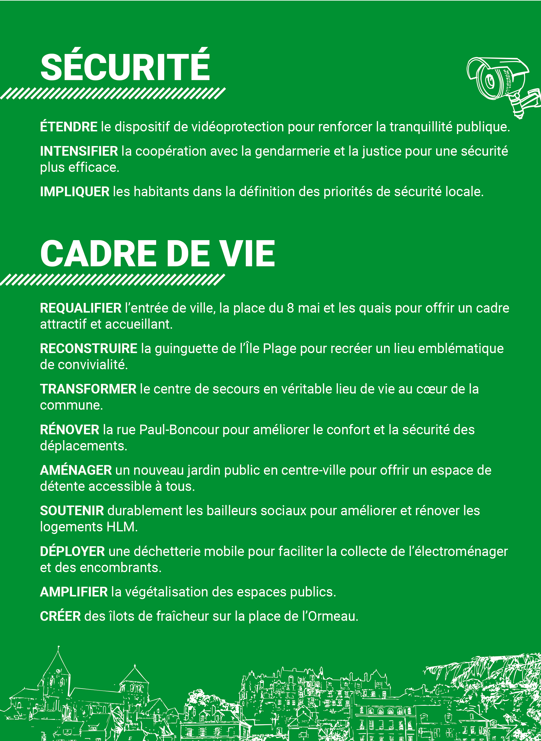 Je souhaite que les prochaines années soient guidées par une stratégie claire afin de poursuivre la modernisation de nos espaces publics, de mieux organiser la mobilité, de valoriser notre patrimoine, de soutenir l’attractivité économique et touristique de notre territoire, de renforcer l’animation de nos lieux de vie, de maintenir une politique culturelle engagée et d’accélérer la transition écologique. L’accès aux soins restera un enjeu majeur, tout comme le soutien aux acteurs qui font vivre la commune et l’ouverture de nouvelles perspectives pour les familles, les jeunes et les séniors.
